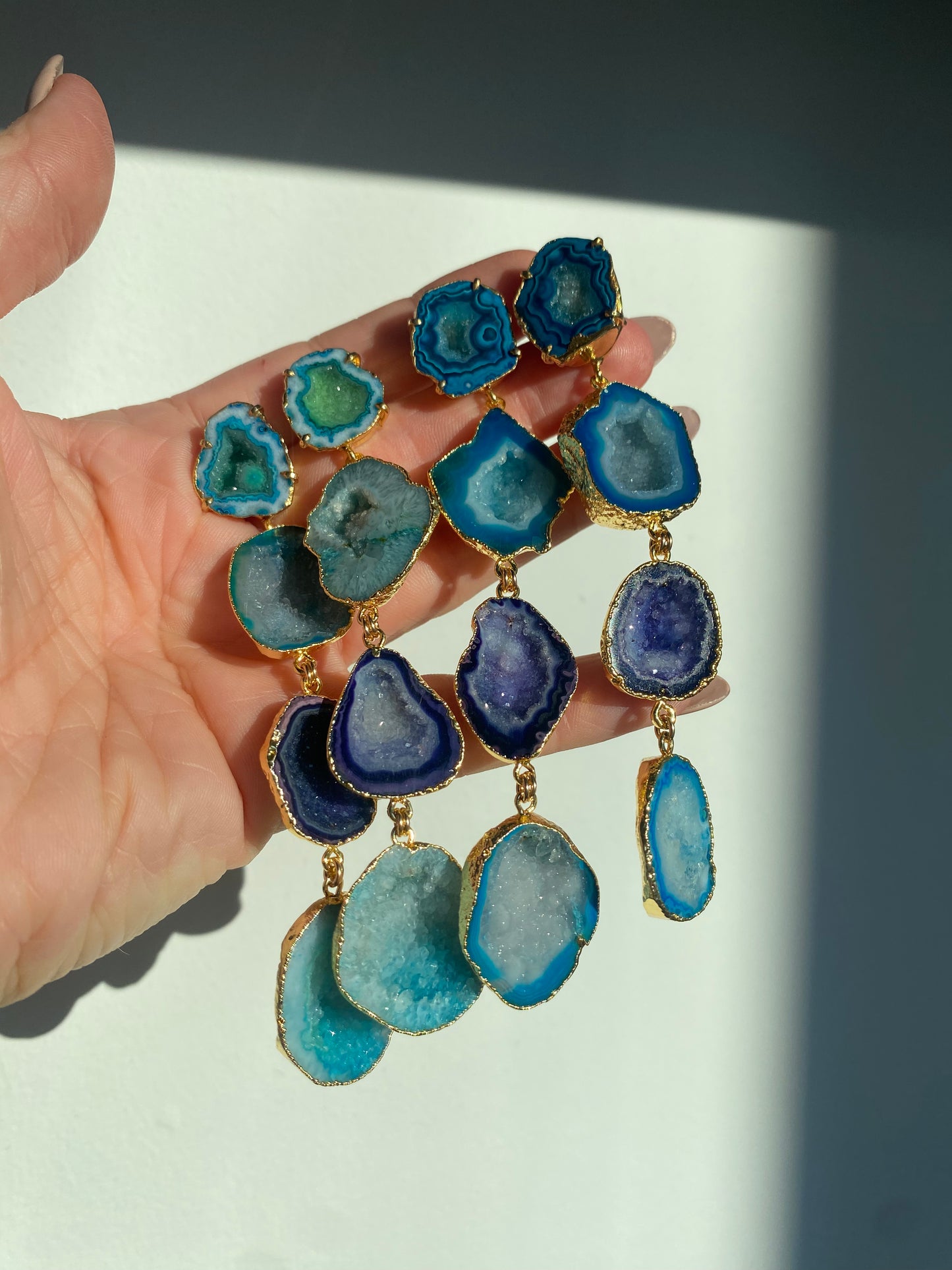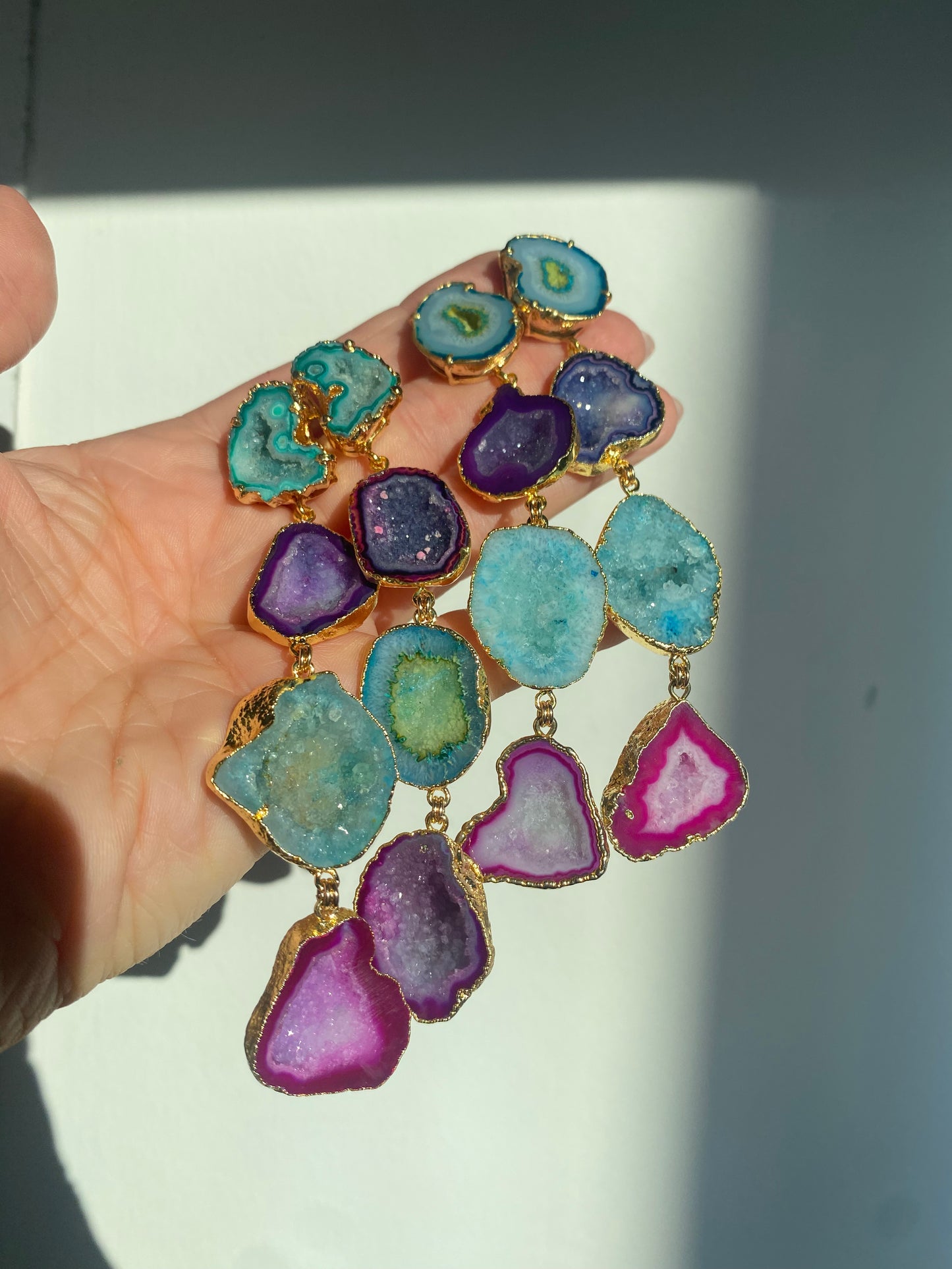 Featuring 8 geodes set in 14k gold. Amina comes in multiple colors, select in the drop down menu. Between 4-5 inches in length and beautifully hover above the collar bone. Can be requested to be smaller or larger as well.