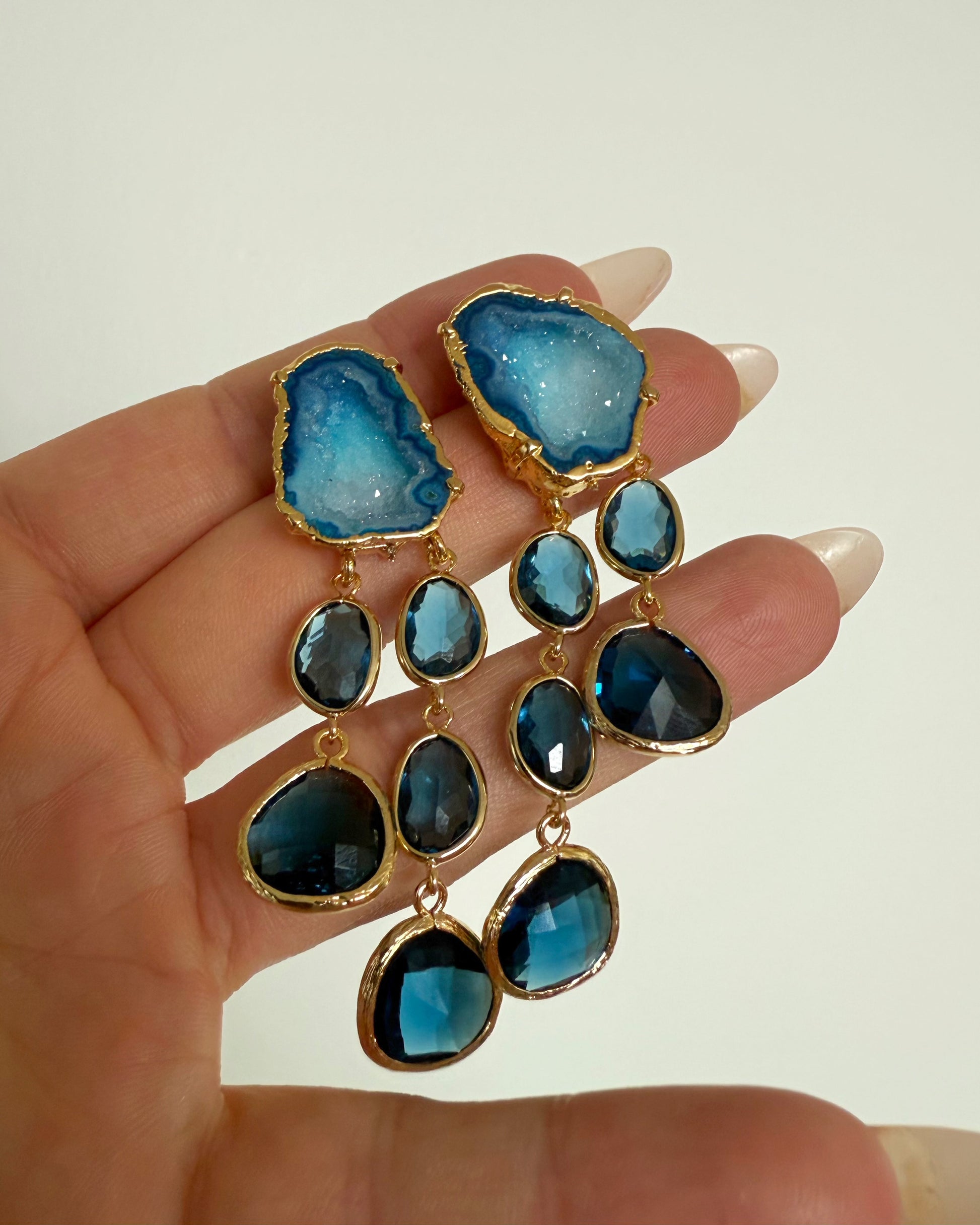 Brand new and for our BRIDES! Our Beck earrings are lightweight and stunning. Featuring a beautiful blue geode electroplated in gold, and blue faceted stones that hang beautifully and catch the light. These are so much lighter than they look!