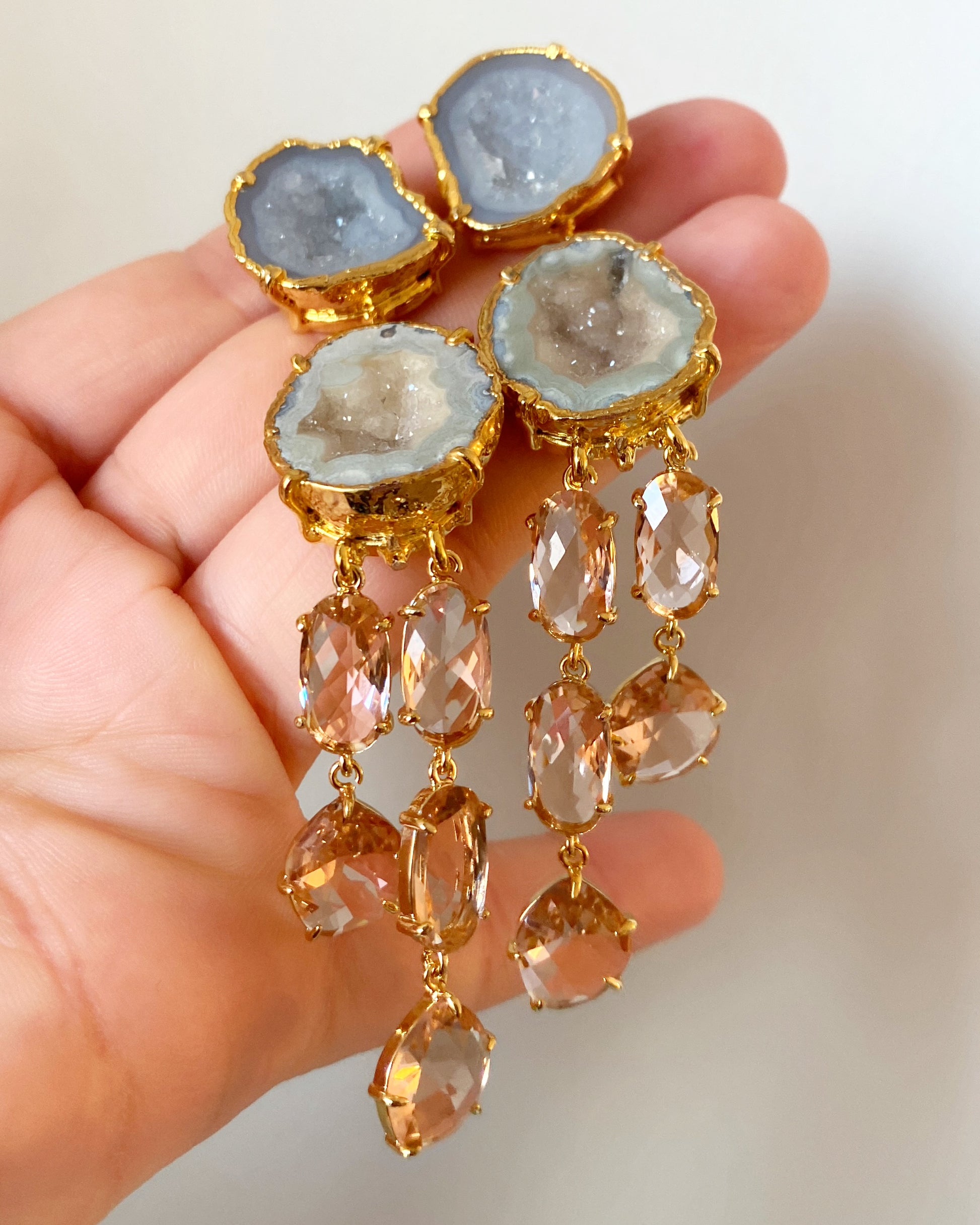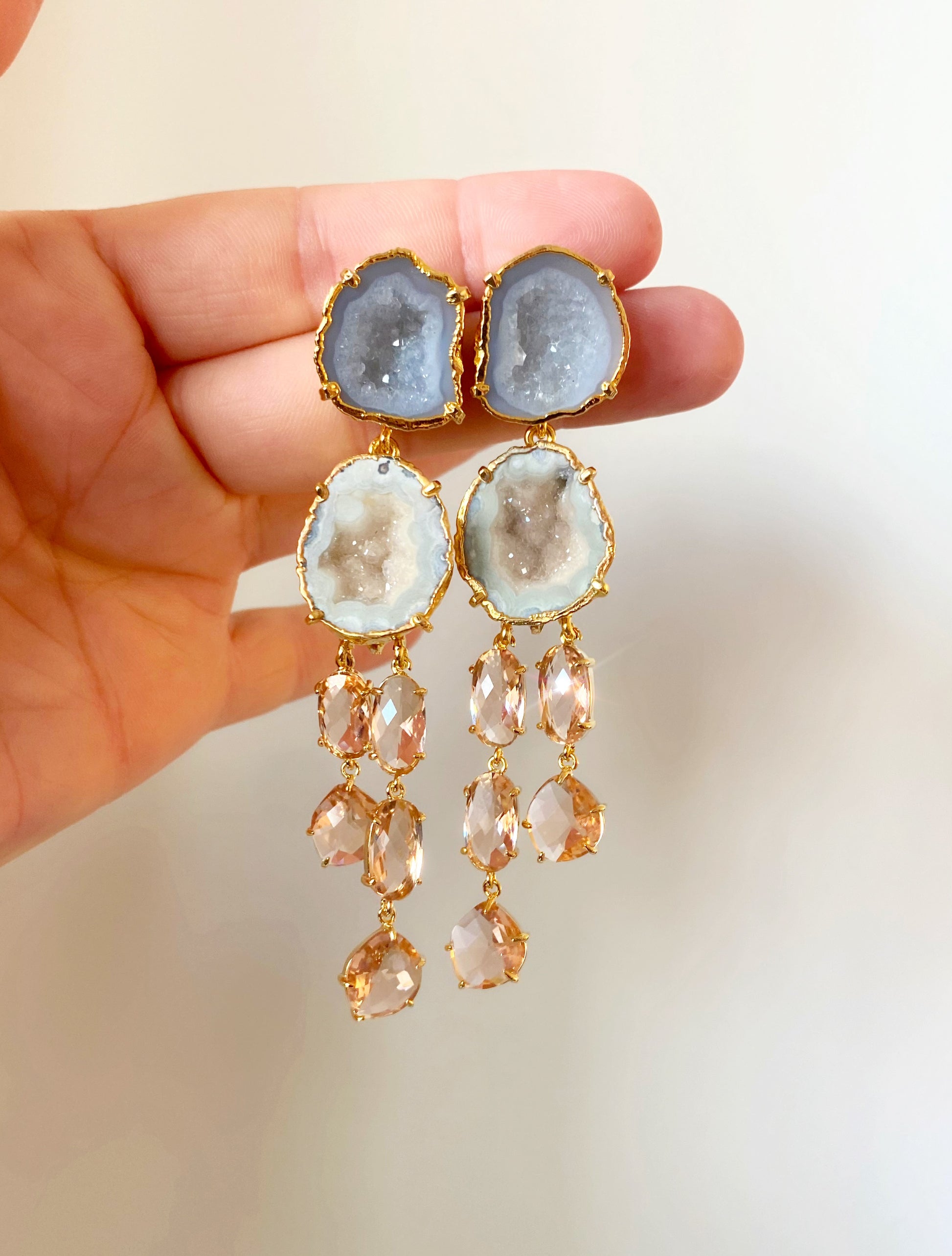 Brand new for Fall/Holiday, and for our BRIDES! our Brynn earrings are lightweight and stunning. Featuring two beautiful white geodes electroplated in gold, and champagne faceted stones that beautifully catch the light.
