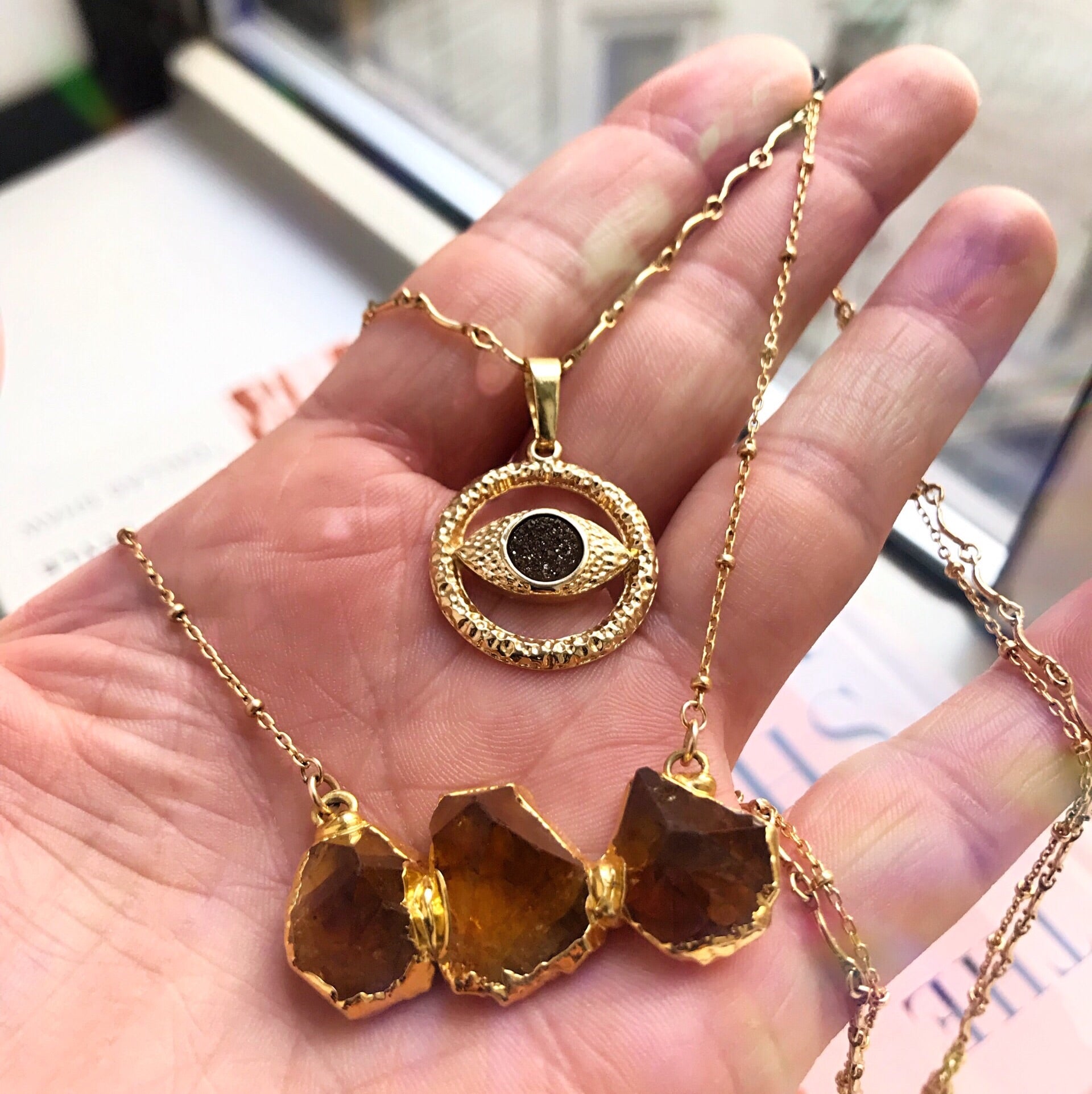 Gold and black evil eye on gold fill bar chain. 19” length. Gold plated lobster clasp.