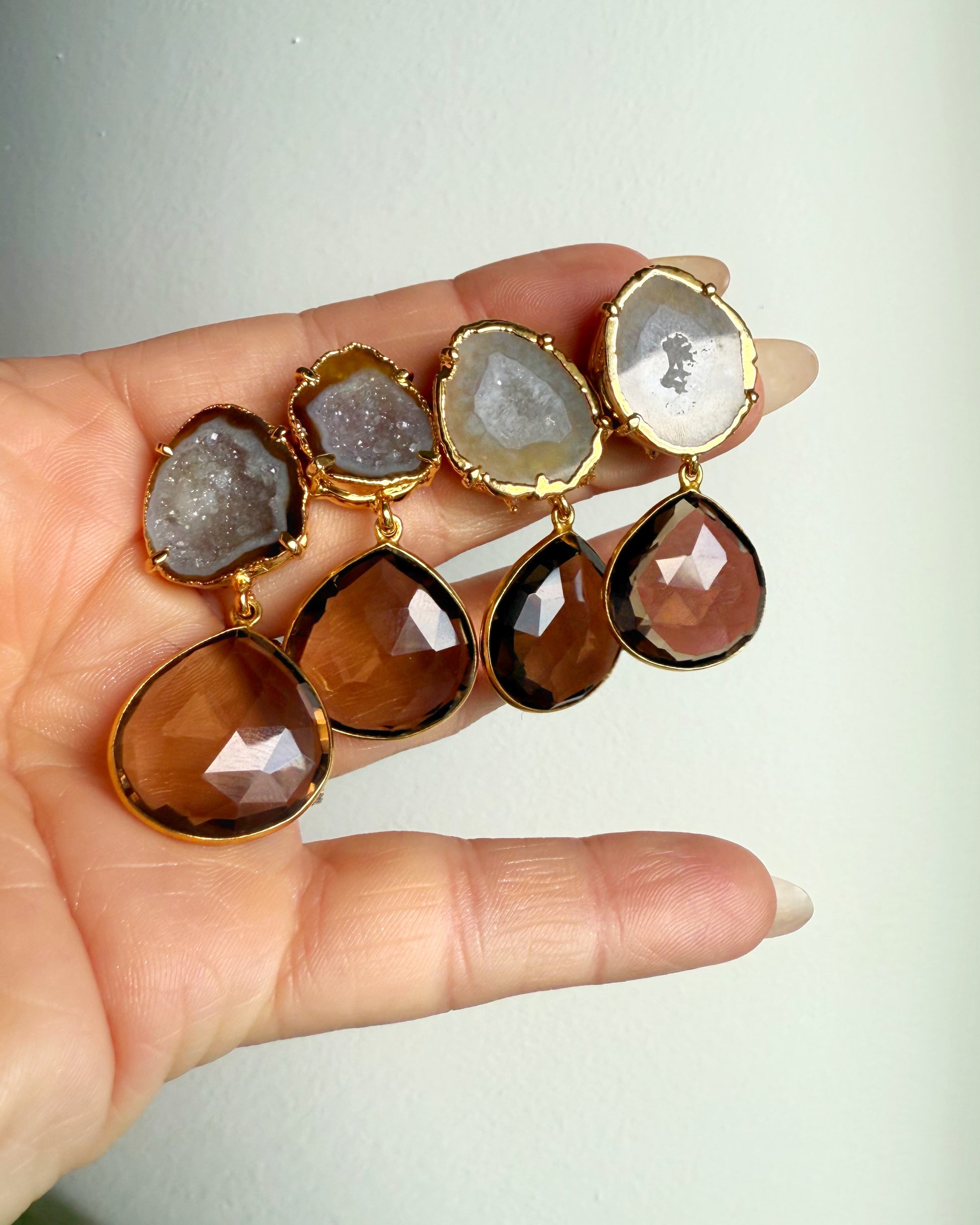 Jennie earrings feature a brown neutral colored geode post in gold and the dreamiest smoky quartz faceted teardrop stones. Perfect neutral for winter! Approximately 2” in length and lightweight.