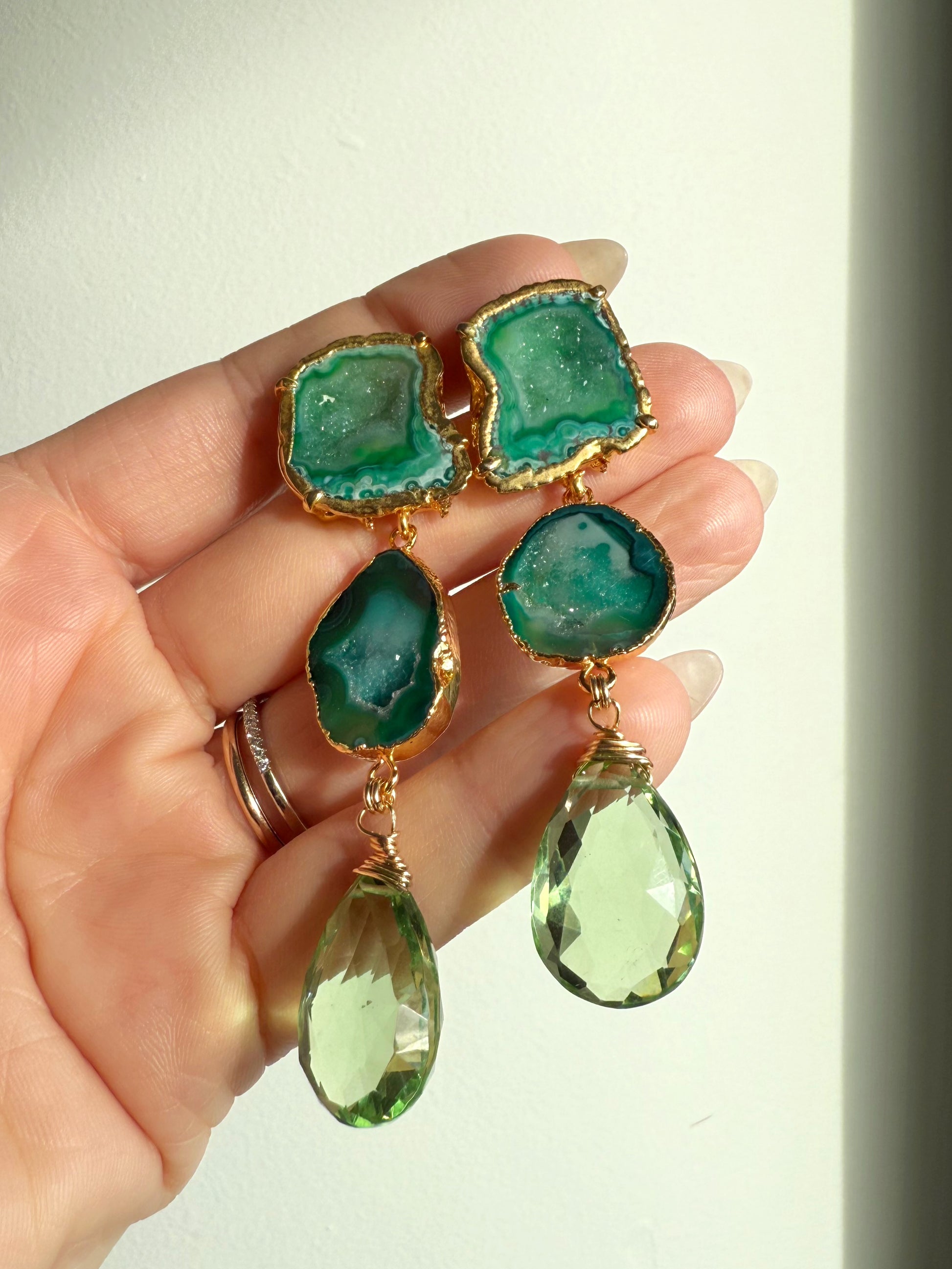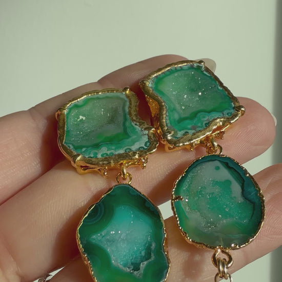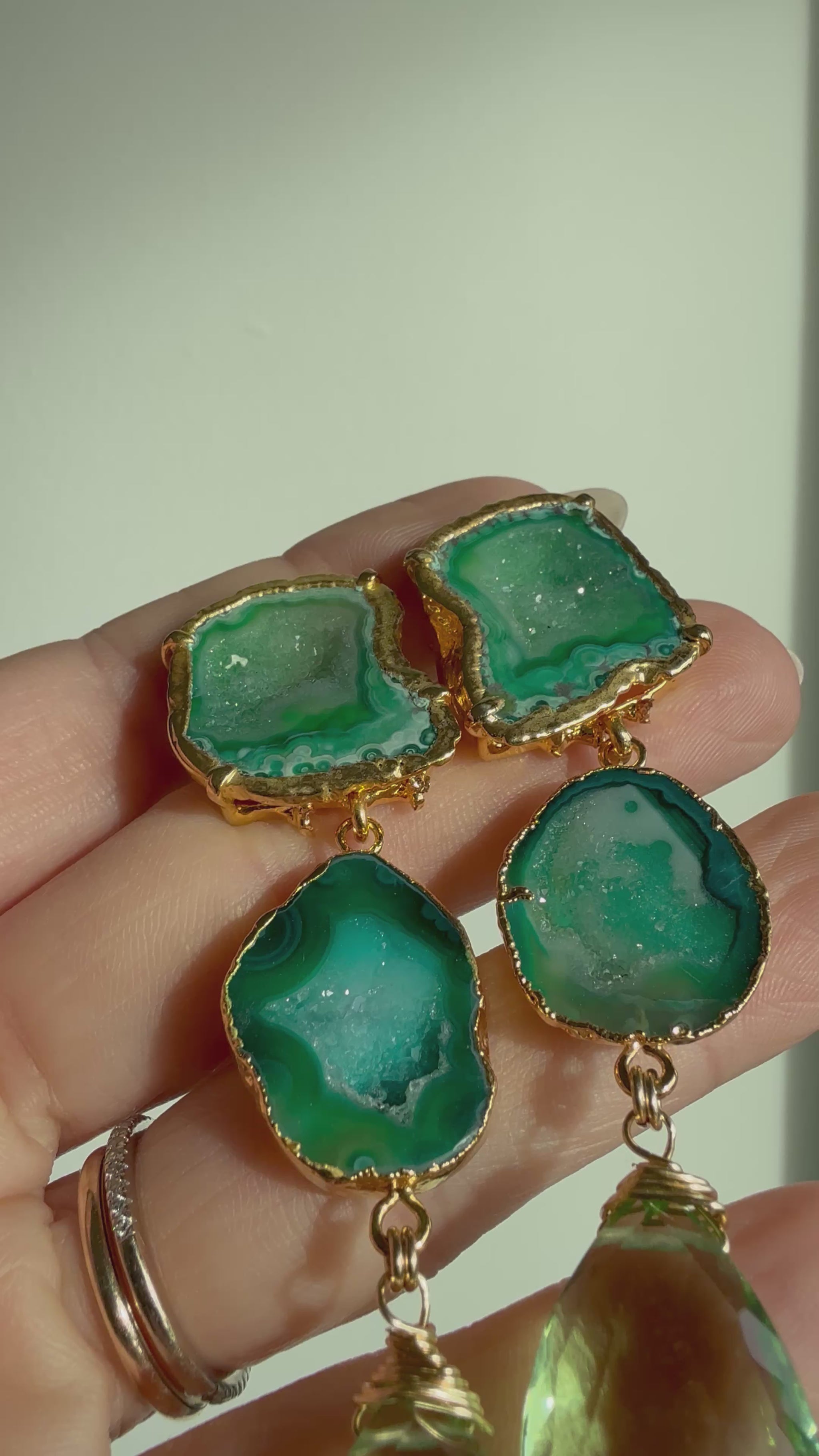 Featuring 4 geodes in various shades of green, electroplated in 14k gold to keep them thin and light, and 2 beautiful green amethyst faceted drops. Between 3-3.5 inches in length and beautifully hover above the collar bone. Can be requested to be smaller or larger as well.