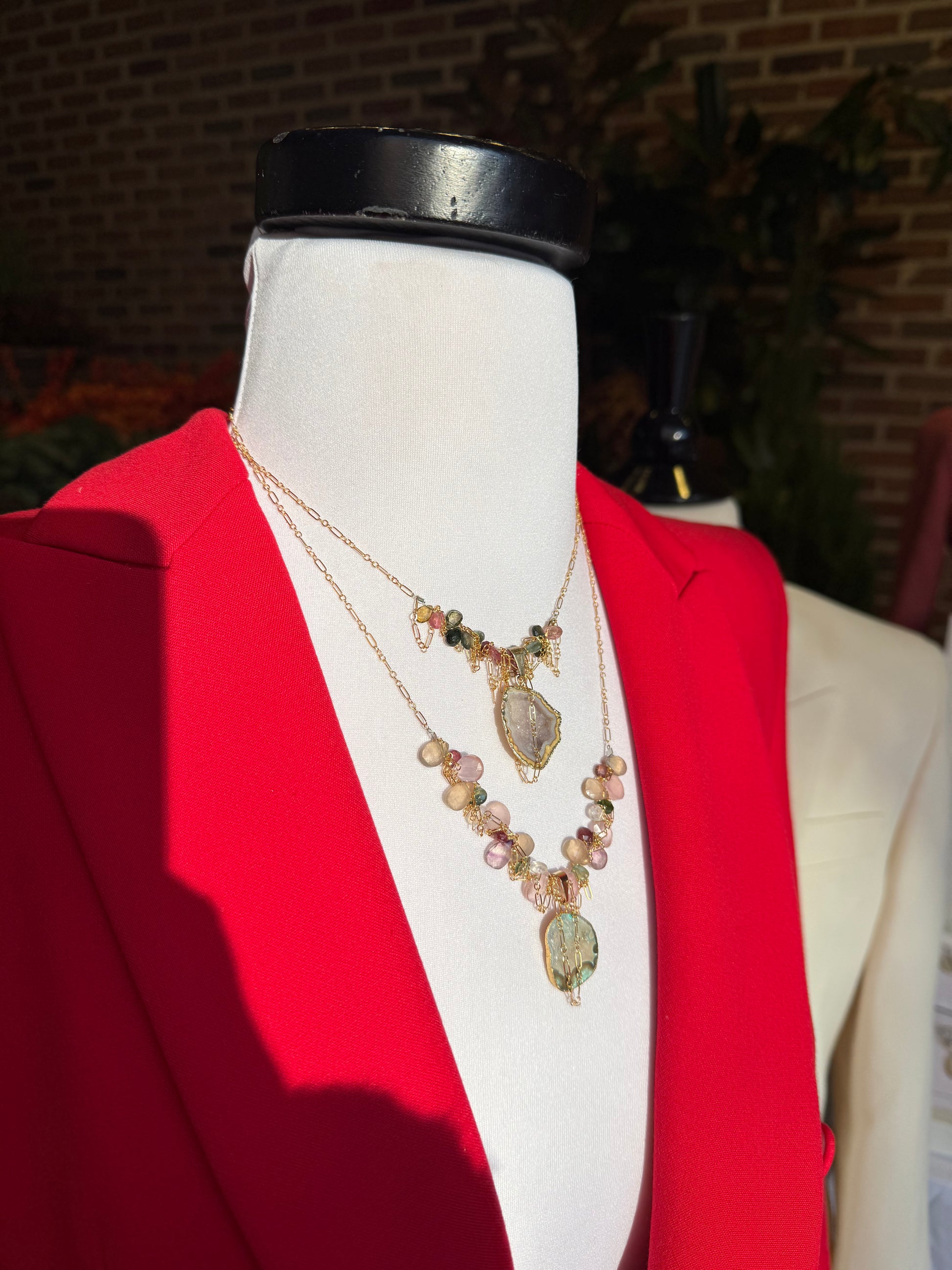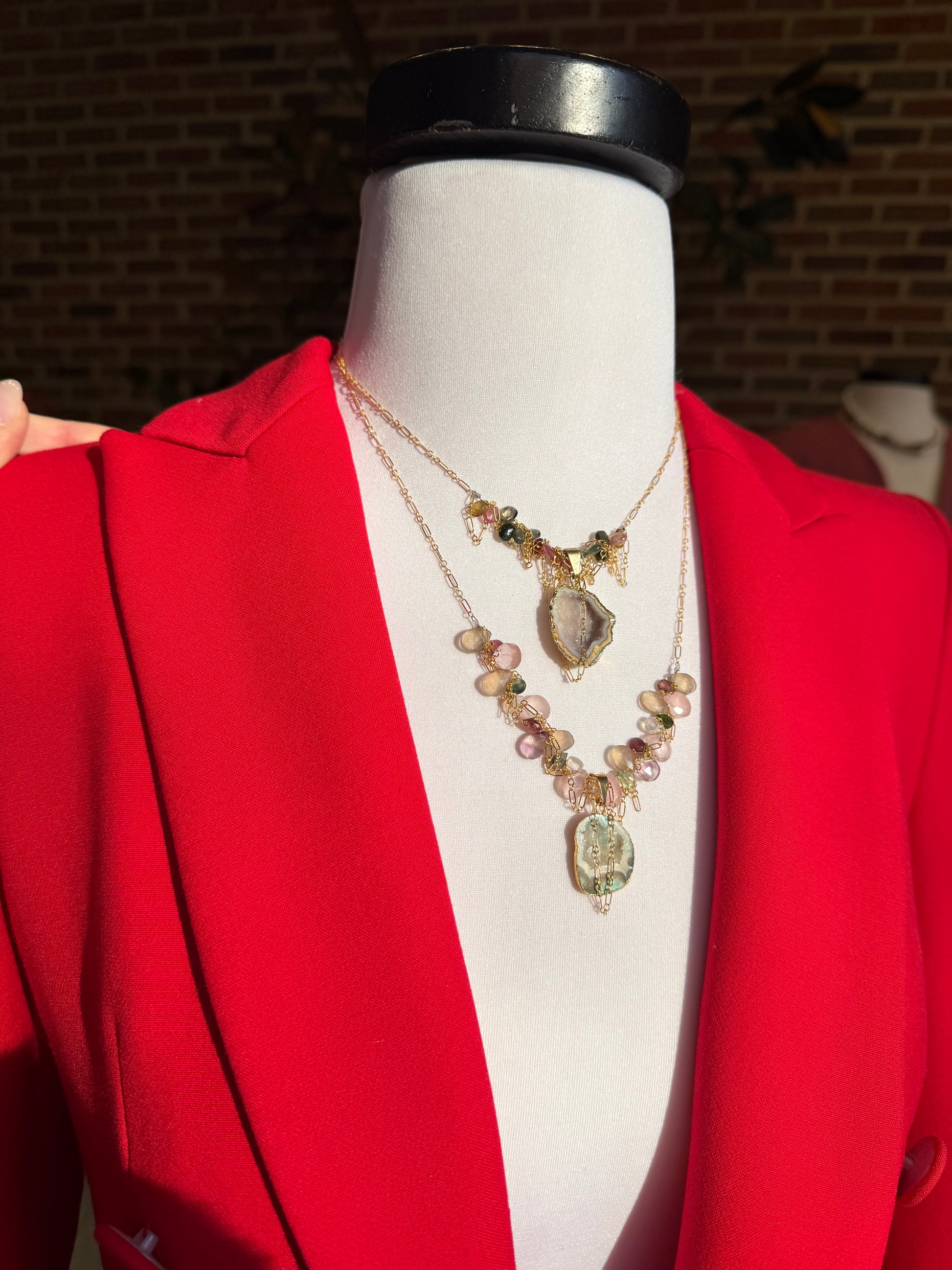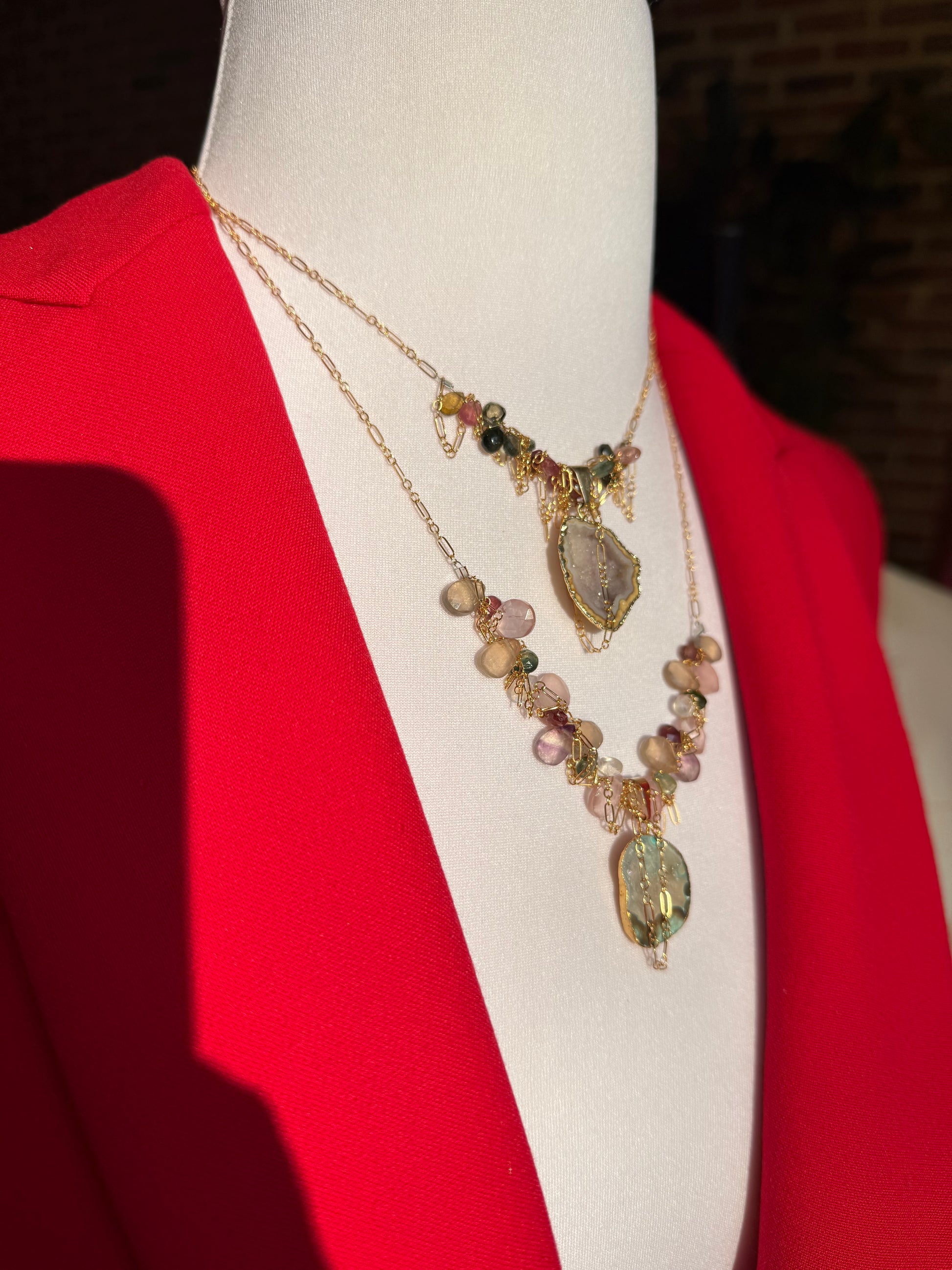 Rumi features geode center and - mixture of tourmaline briolettes with petite gold chain. Necklace is 18” with lobster clasp. It’s so light a delicate and all are one-of-a-kind!