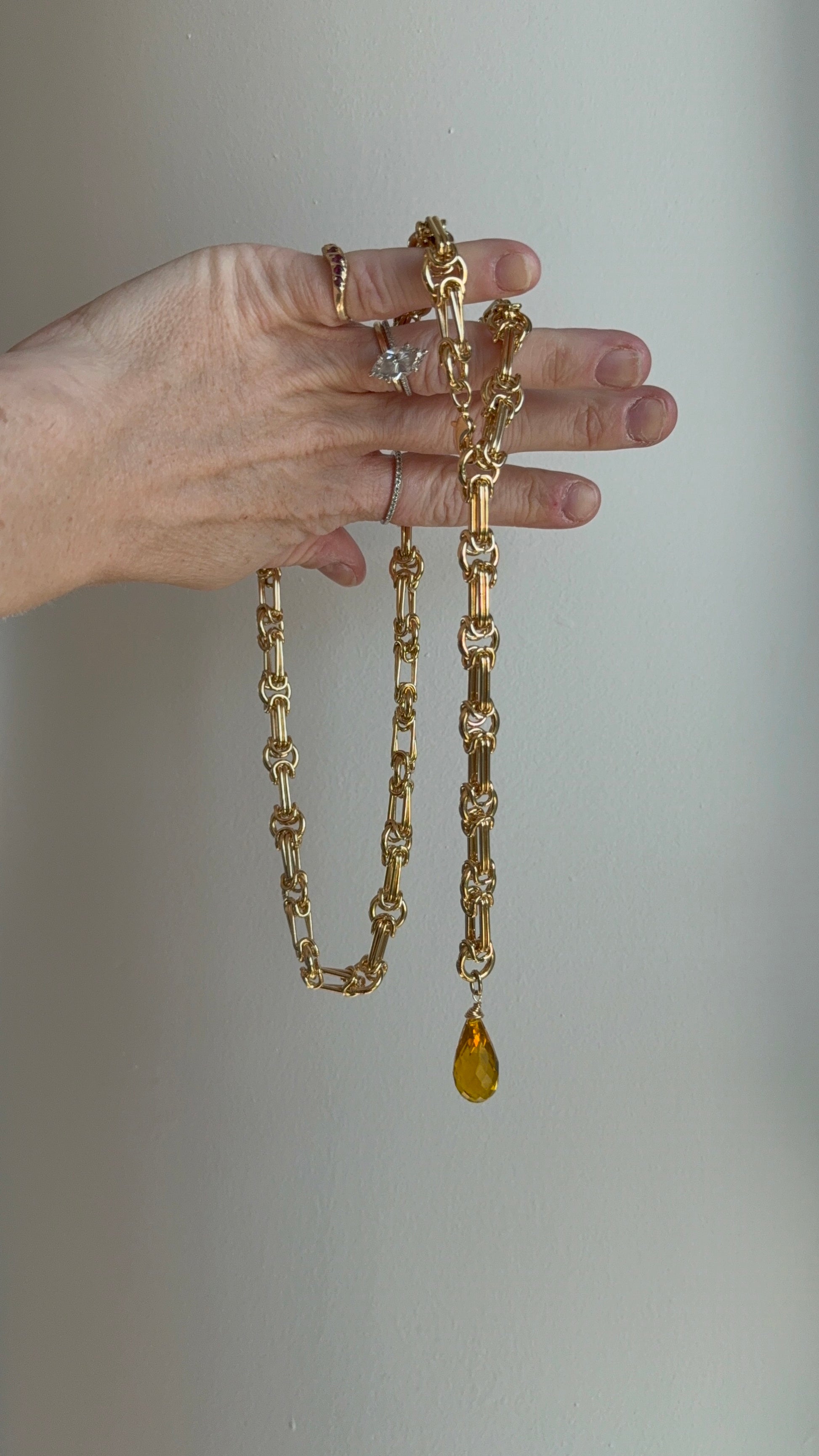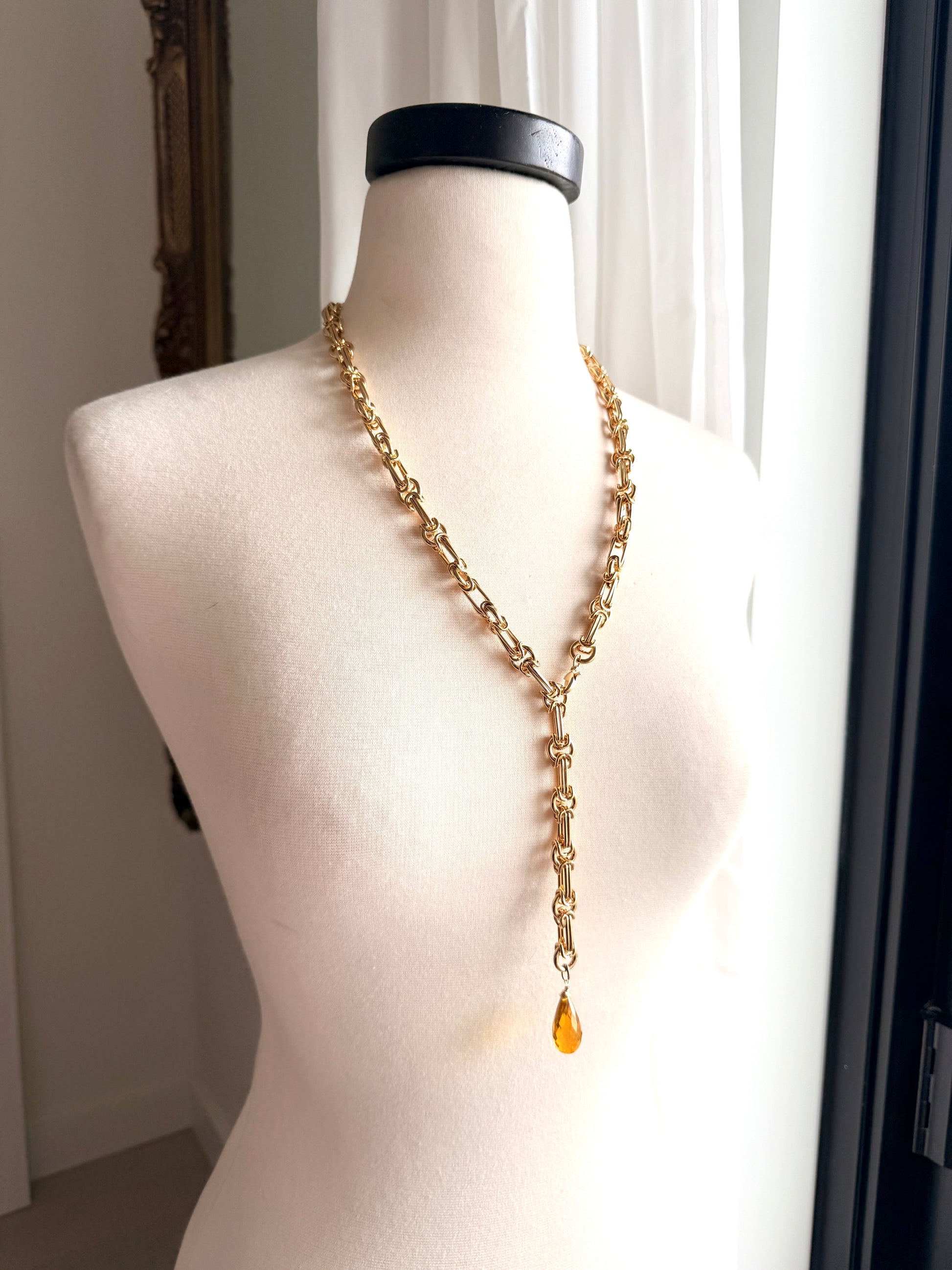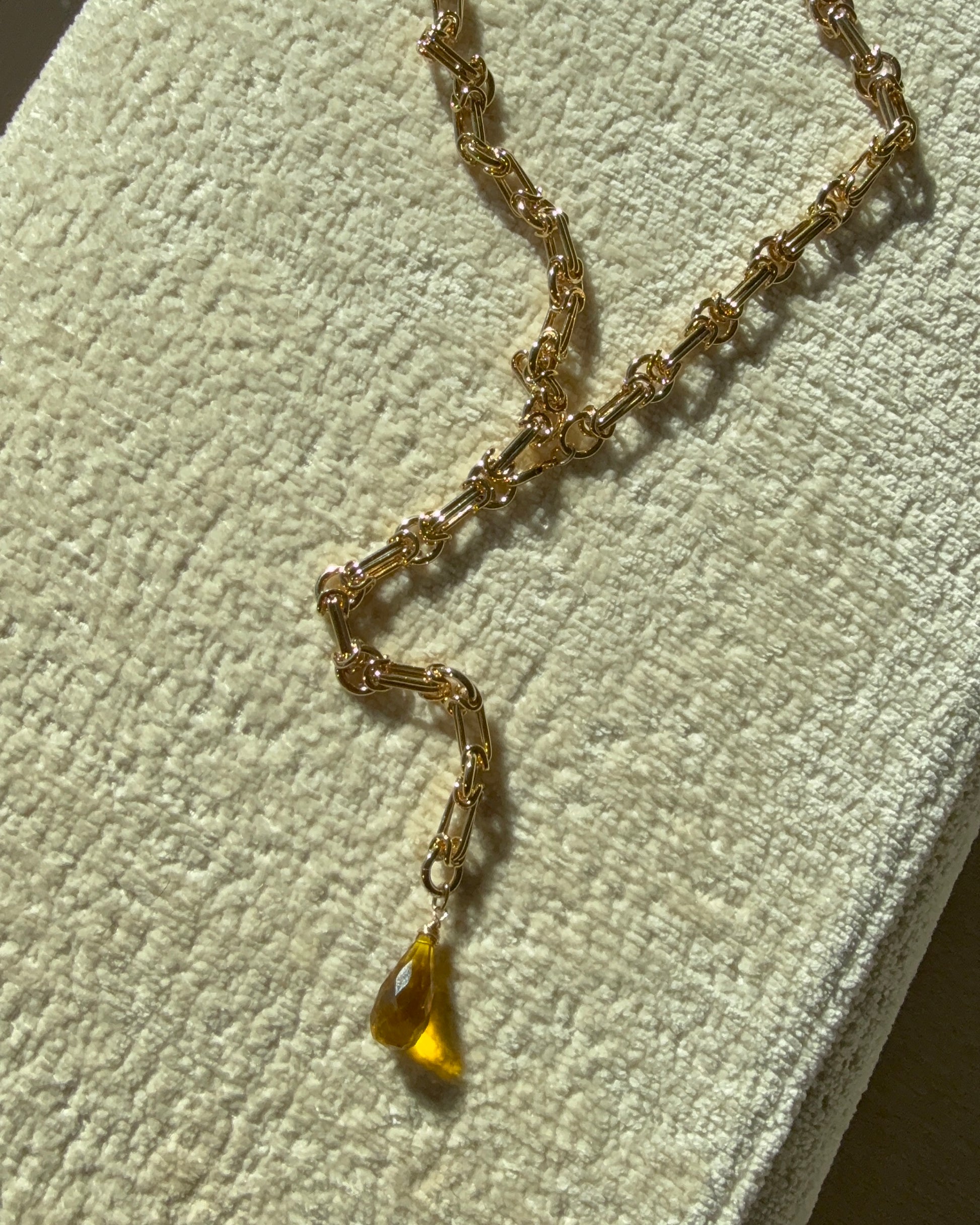 Drew Lariat is your favorite gold chain in a longer style that can clasp anywhere and be worn multiple ways. Features a faceted citrine stone on the end that’s wire wrapped. Available in pyrite as well!