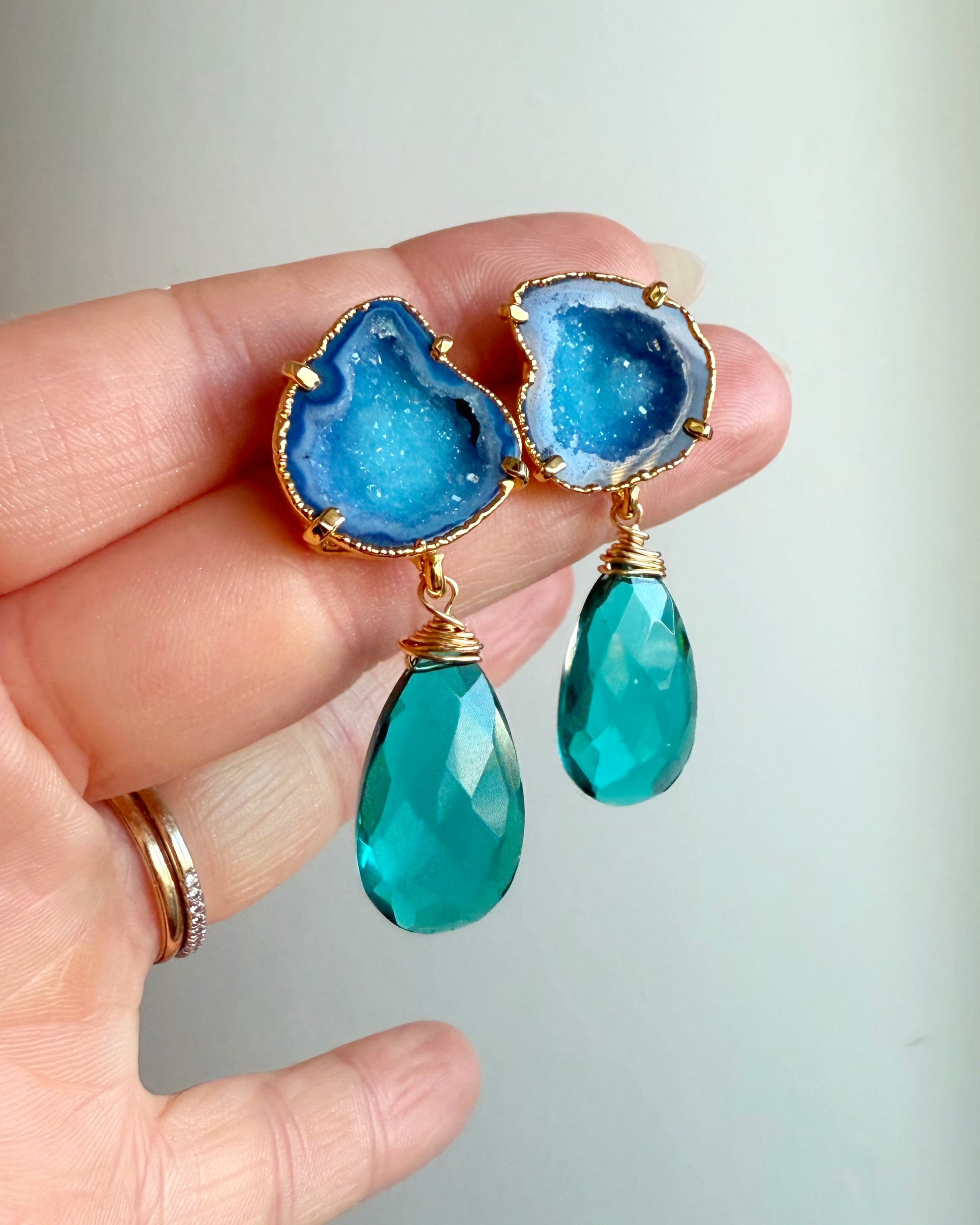 Blue Geode Post in gold. Teal faceted pear bottom that are wire wrapped. These earrings are lightweight and so pretty when they catch the light. Approximately 2” in length.